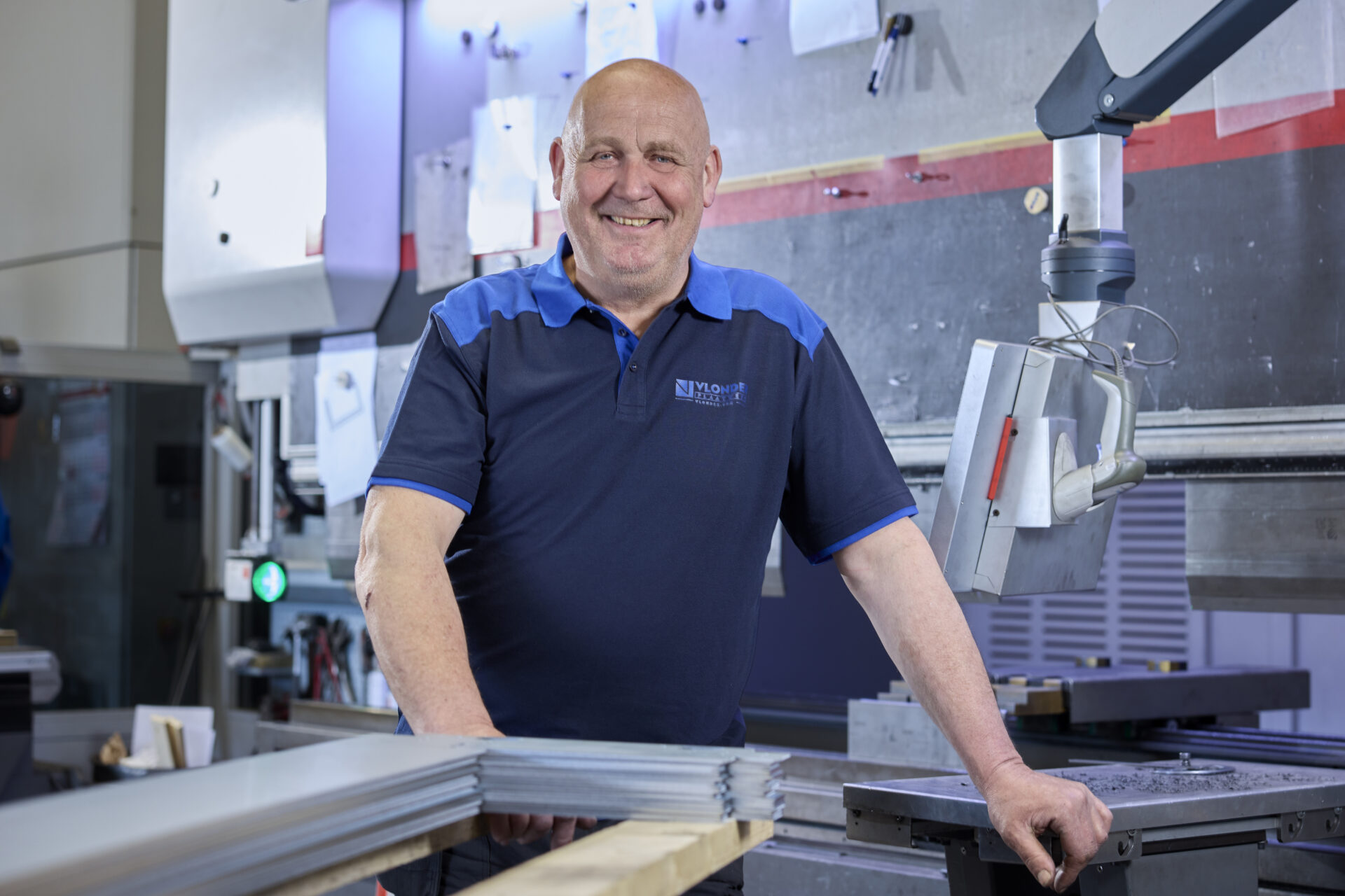Alle klanten van Vlonder Plaatwerk kennen Hans. Niet alleen omdat hij er al bijna 40 jaar rondloopt, maar vooral omdat hij overal zichtbaar is. Hij controleert orders, ontvangt klanten en helpt met laden en lossen. “Ik zie het ook als een vorm van kwaliteitscontrole,” vertelt hij. Hans is vaak het eerste aanspreekpunt en is daardoor ook het gezicht van de werkplaats. “Als ik een busje zie aankomen, weet ik al welke klant het is”, zegt hij met een lach. Hans is er altijd, van ’s ochtends vroeg tot ’s avonds laat. En dat voel je in de werkplaats. Hij is een wandelend archief vol kennis en ervaring. Juist daarom staat hij ook met plezier klaar voor de jonge generatie. “Zit er potentie in iemand, dan help ik diegene graag vooruit,” zegt hij. “Dit is echt ambachtelijk werk en een robot kan dat niet overnemen. Daarom is werkplezier en het doorgeven van enthousiasme voor het vak extra belangrijk.”